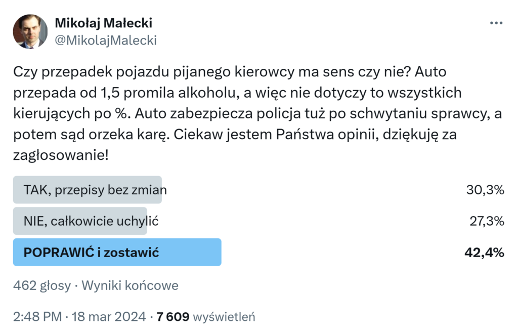 Z przeprowadzonej ankiety przez prowadzącego program dr. hab. Mikołaja Małeckiego na platformie X wynika, że większość głosujących jest „za” pozostawieniem (część z nich – po poprawkach) przepadku pojazdu mechanicznego w Kodeksie karnym.